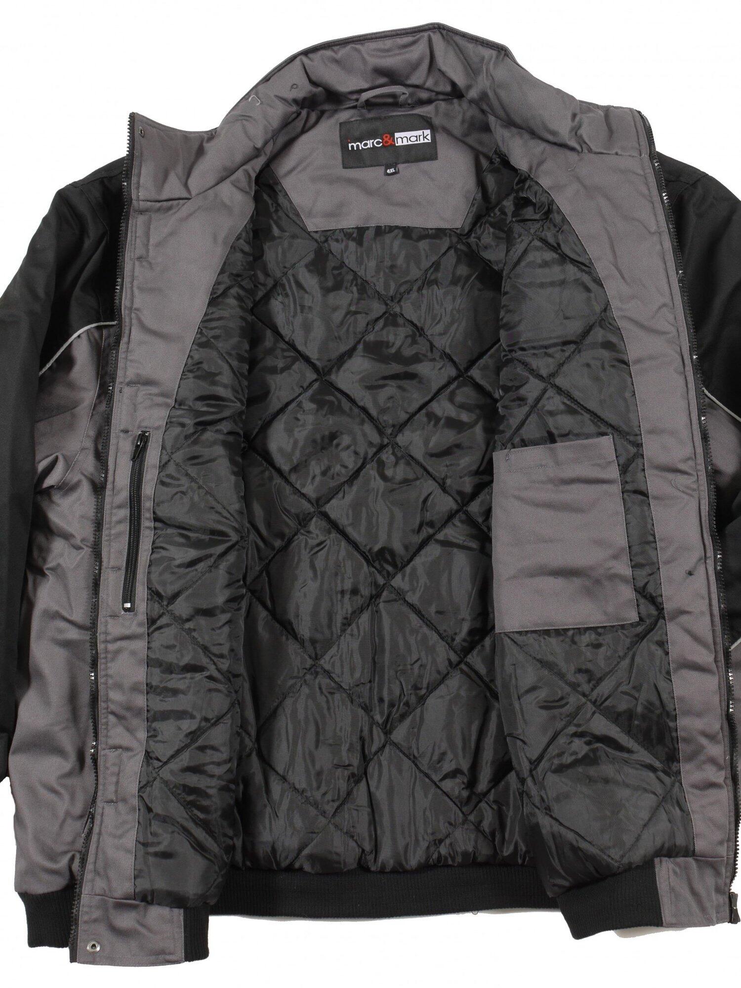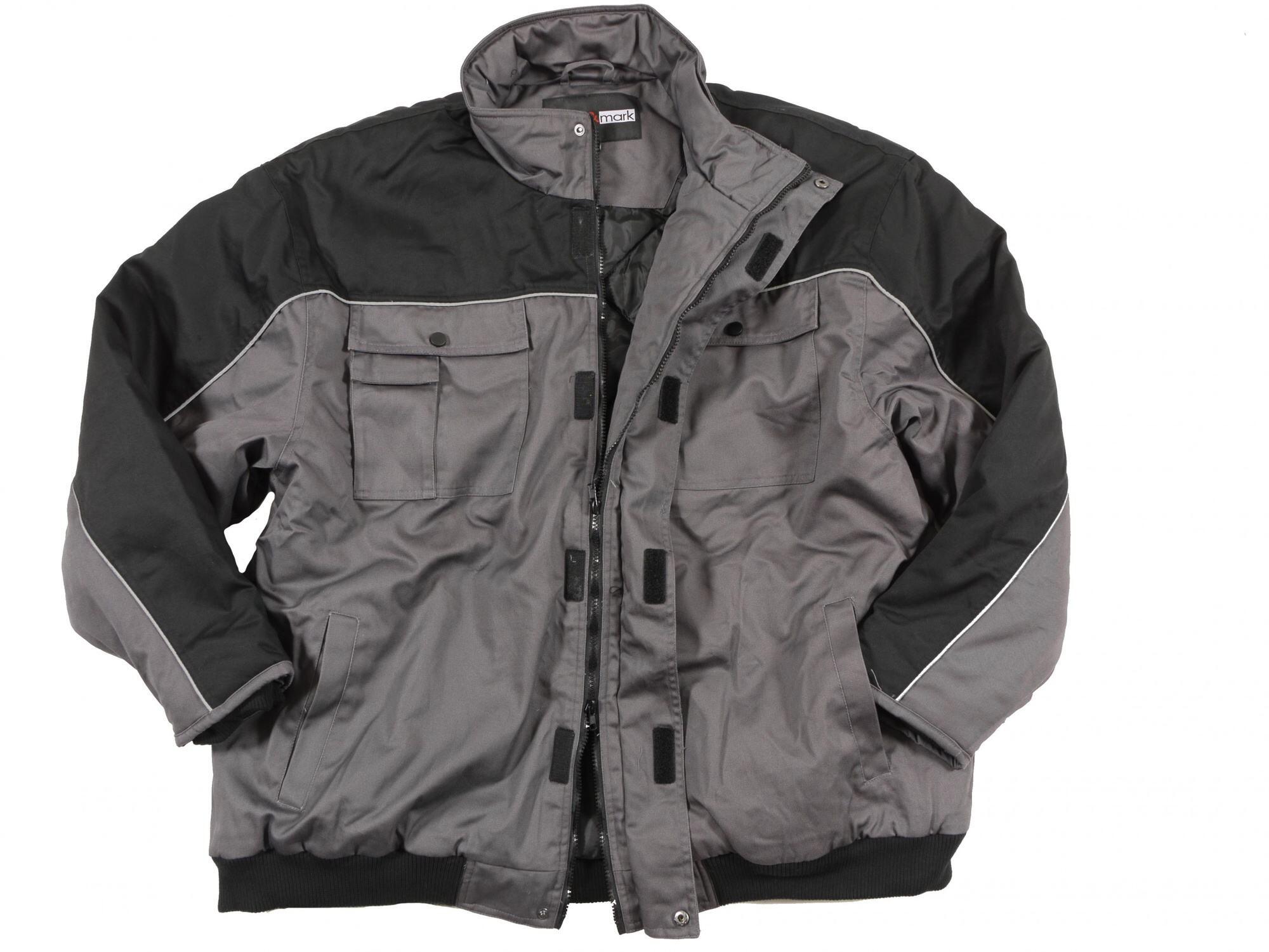 Arbetsjackan är i färgen kolgrå och har svart kontrastfärg på ärmarna, axlarna och den övre delen av bröstet och ryggen. Dessutom är muddkanten också svart. Denna arbetsjacka i stora storlekar för män har många fickor och olika detaljer.
