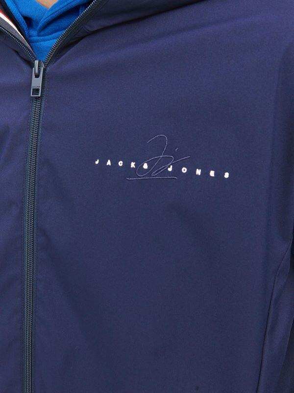 Marinblå övergångsjacka från Jack & Jones. Jackan har hel dragkedja samt huva med dragsko.
