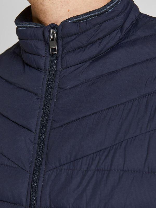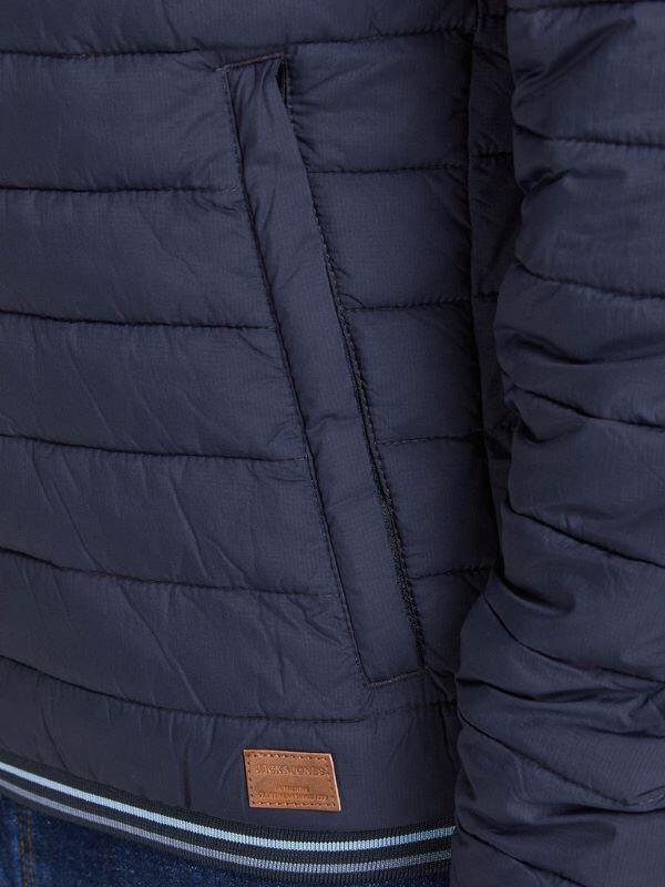 Navyblå övergångs-bomberjacka från Jack & Jones. Jackan har lätt vaddering och en hel dragkedja som kan dras upp ända till kragen.