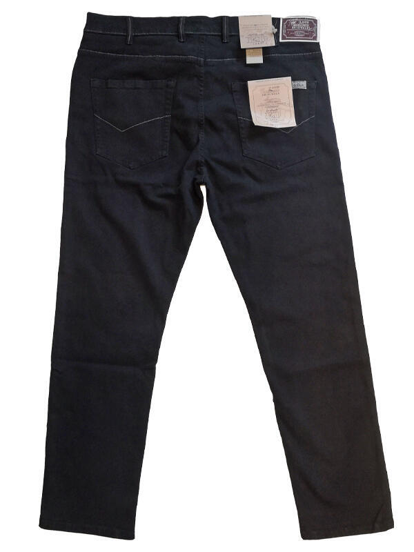 Svarta jeans med 5 fickor i klassisk modell med stretch. Dessa jeans har ljusgrå sömmar på fickorna, i linningen och längs benen.