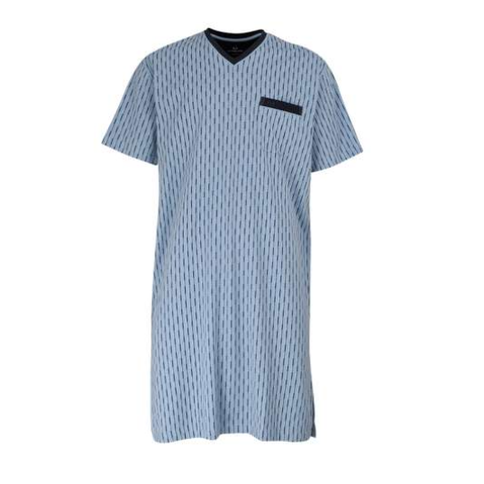 Lång nattskjorta/nattlinne med korta ärmar för män från Götzburg. Denna nattskjorta är blå med heltryckt mönster. Den har slitsar i sidorna och V-ringning med marinblå kant.