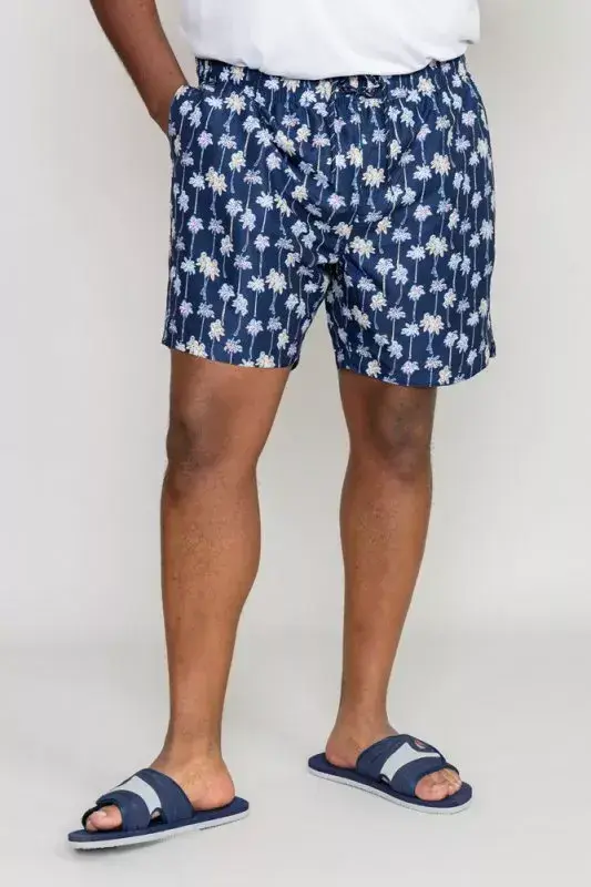 Marinblå badeshorts från D555. Det finns ett "palm"-tryck på shortsen i många fina färger.