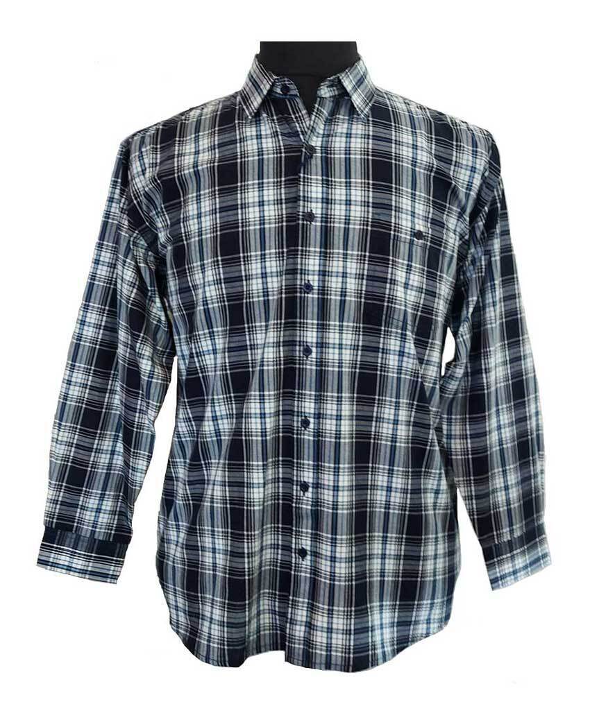 Skjortan har klassisk krage och en bröstficka på vänster sida. Fickan stängs med en knapp. Knapparna på skjortan är mörka. Det finns även knappar i manschetterna.
