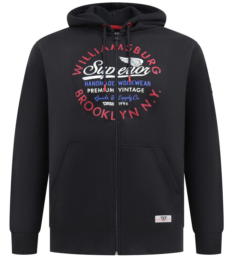 På bröstet hittar du ett stort tryck i rött, vitt och blått med texten “Williamsburg Superior Brooklyn N.Y.”, som ger hoodtröjan ett sportigt och urbant uttryck. Ribbstickade kanter vid ärmar och fåll säkerställer en bra passform, medan de genomtänkta detaljerna fulländar designen.