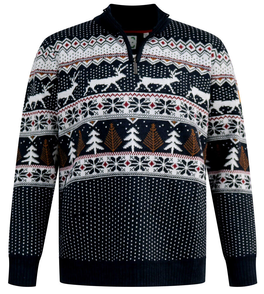 Denna marinblå stickade tröja från D555 kombinerar klassisk vinterdesign med värme och komfort. Tröjan har ett vackert jacquardmönster med renar, träd och snöflingor i vita och bruna detaljer, som ger ett tidlöst uttryck.