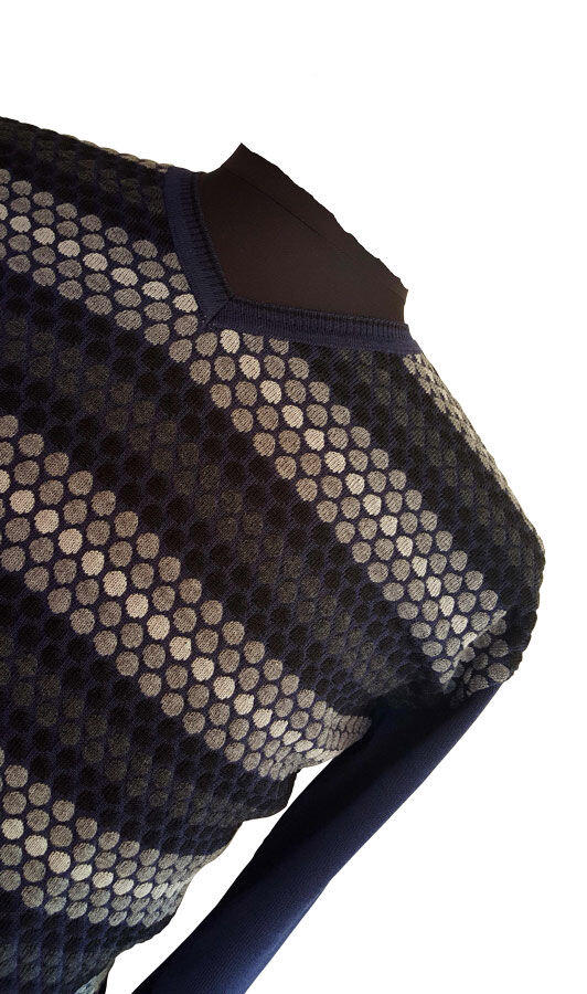 En härlig och lätt herrstickad tröja med mönster och V-ringning. Basfärgen är navyblå. Ärmslut och nederkant har ribbade kanter.