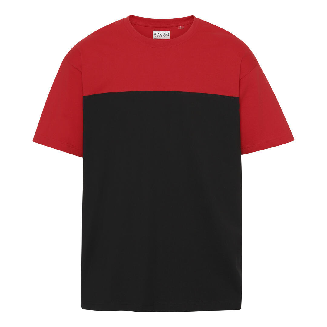 Tvåfärgad T-shirt med rund hals från ARKURI Fashion. Överdelen av T-shirten är röd och kroppen är svart.