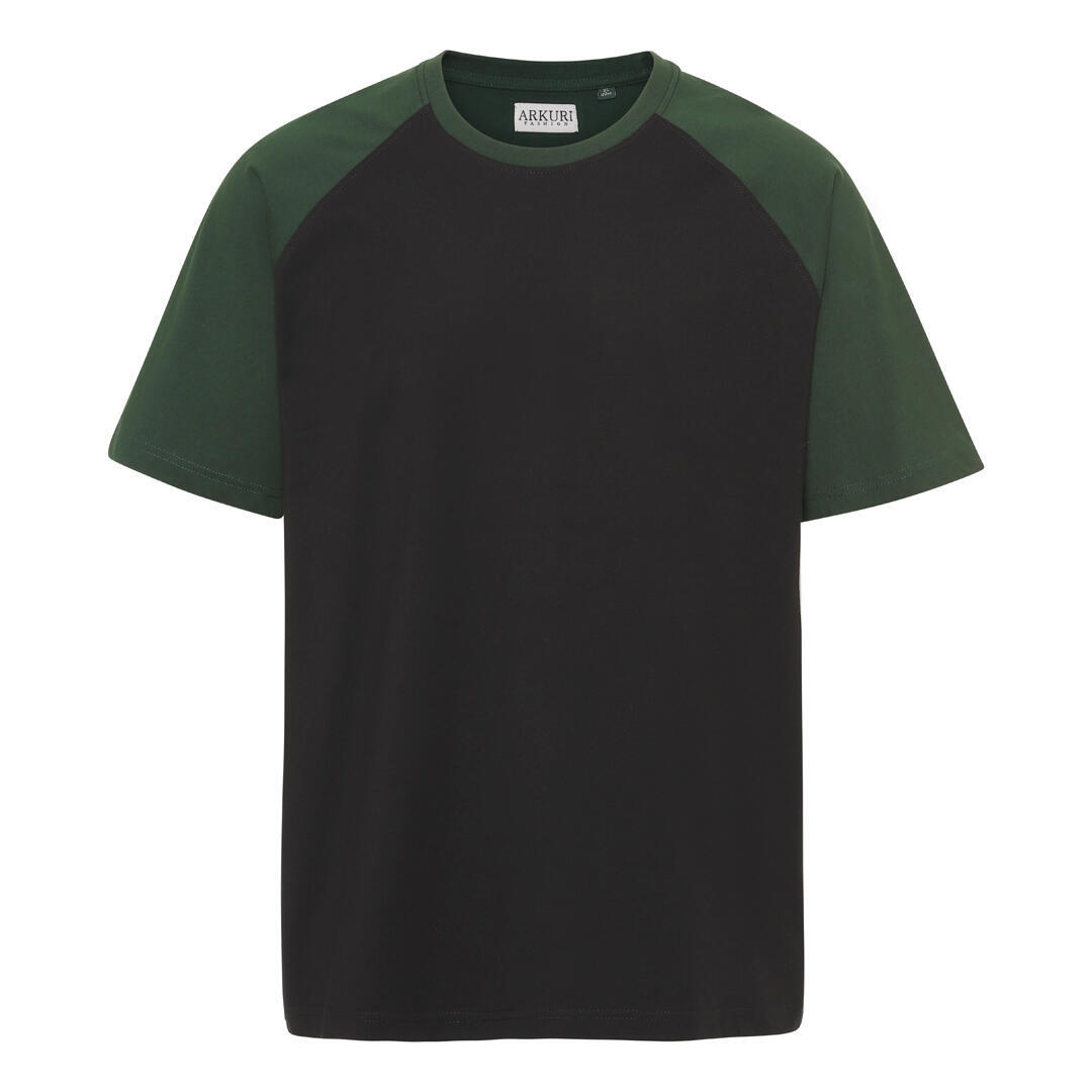 Svart T-shirt med kontrasterande flaskgröna raglanärmar.