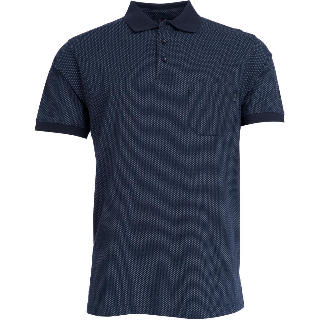 Denna marinblå piké har ett diskret ton-i-ton-mönster som ger ett klassiskt utseende med lite extra karaktär. Den är tillverkad i en bekväm blandning av bomull och polyester som känns mjuk och lätt, och samtidigt behåller passformen fint – även efter upprepad användning.