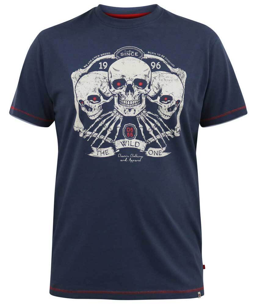 Dov blå T-shirt med "trio av skelettskallar"-tryck - D555