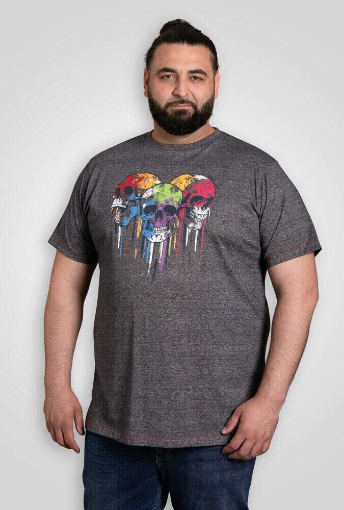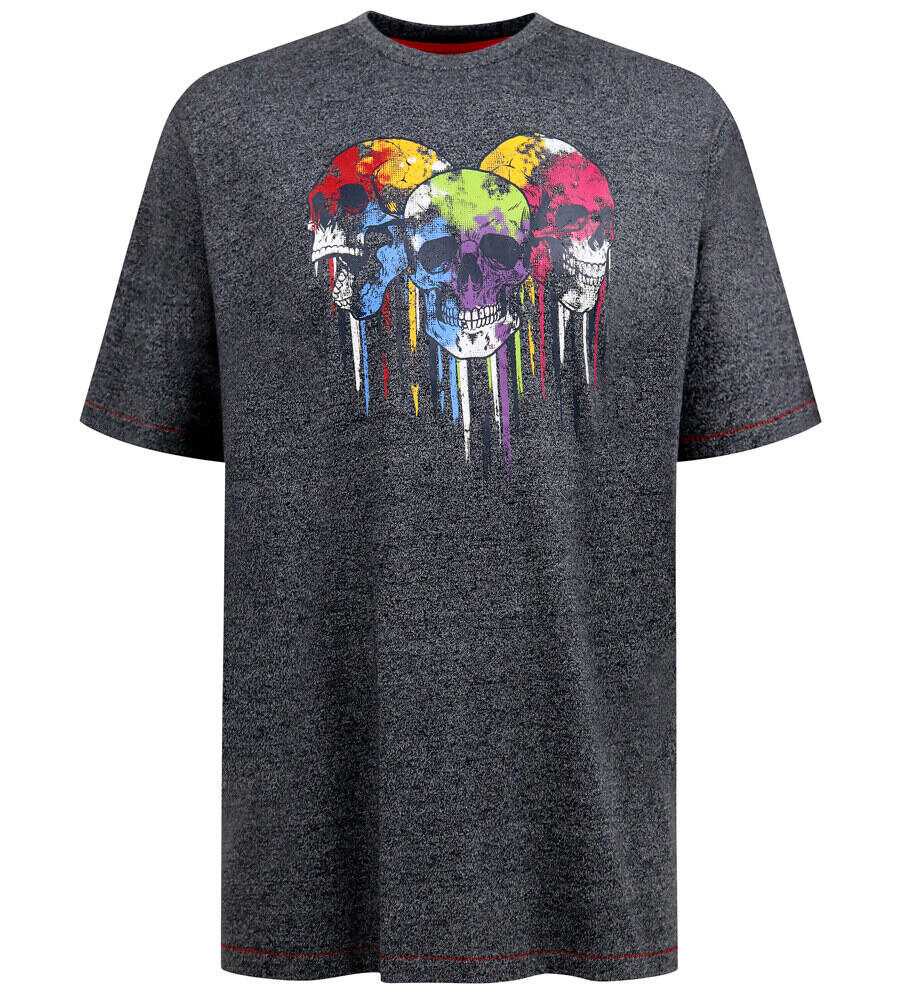 Denna marinmelerade T-shirt från D555 är ett självklart val för dig som vill ha ett markant och annorlunda uttryck. På framsidan pryds den av ett stort färgglatt tryck med tre dödskallar i blått, grönt, gult, rött och lila, vilket skapar en rå och iögonfallande effekt.
