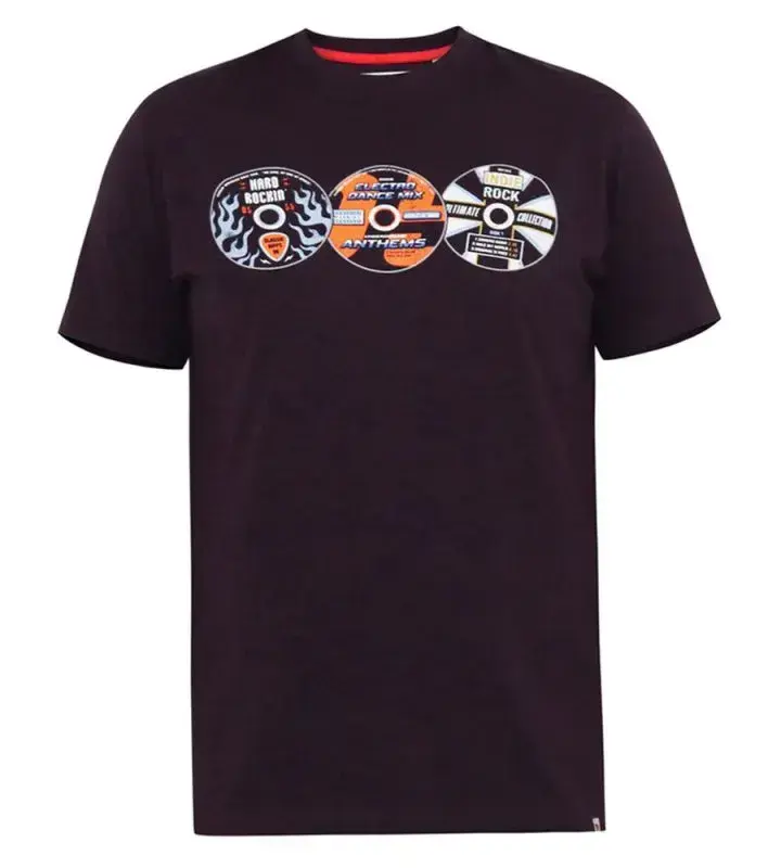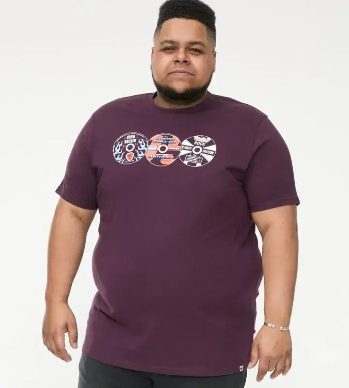 En snygg plommonfärgad T-shirt som är prydd med tre grafiska tryck på bröstet som liknar CD-skivor med olika mönster och text. Trycket ger ett retro och musikaliskt uttryck.