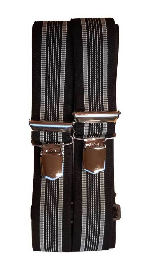 Svarta hängslen med grå ränder. Hängslena är extra breda med sina 3,3 cm. De har kraftiga klämmor som "biter" sig ordentligt fast i dina jeans eller byxor.
