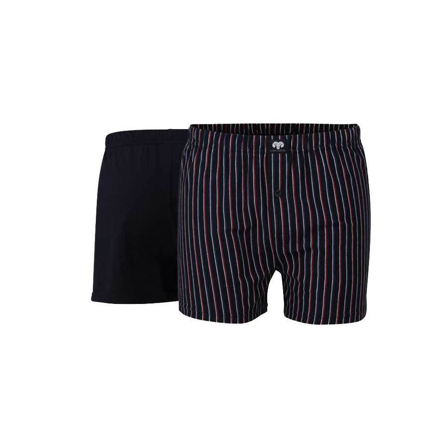 Förpackning: 2-pack boxershorts (en enfärgad mörkblå + mörkblå med röda och vita ränder)
